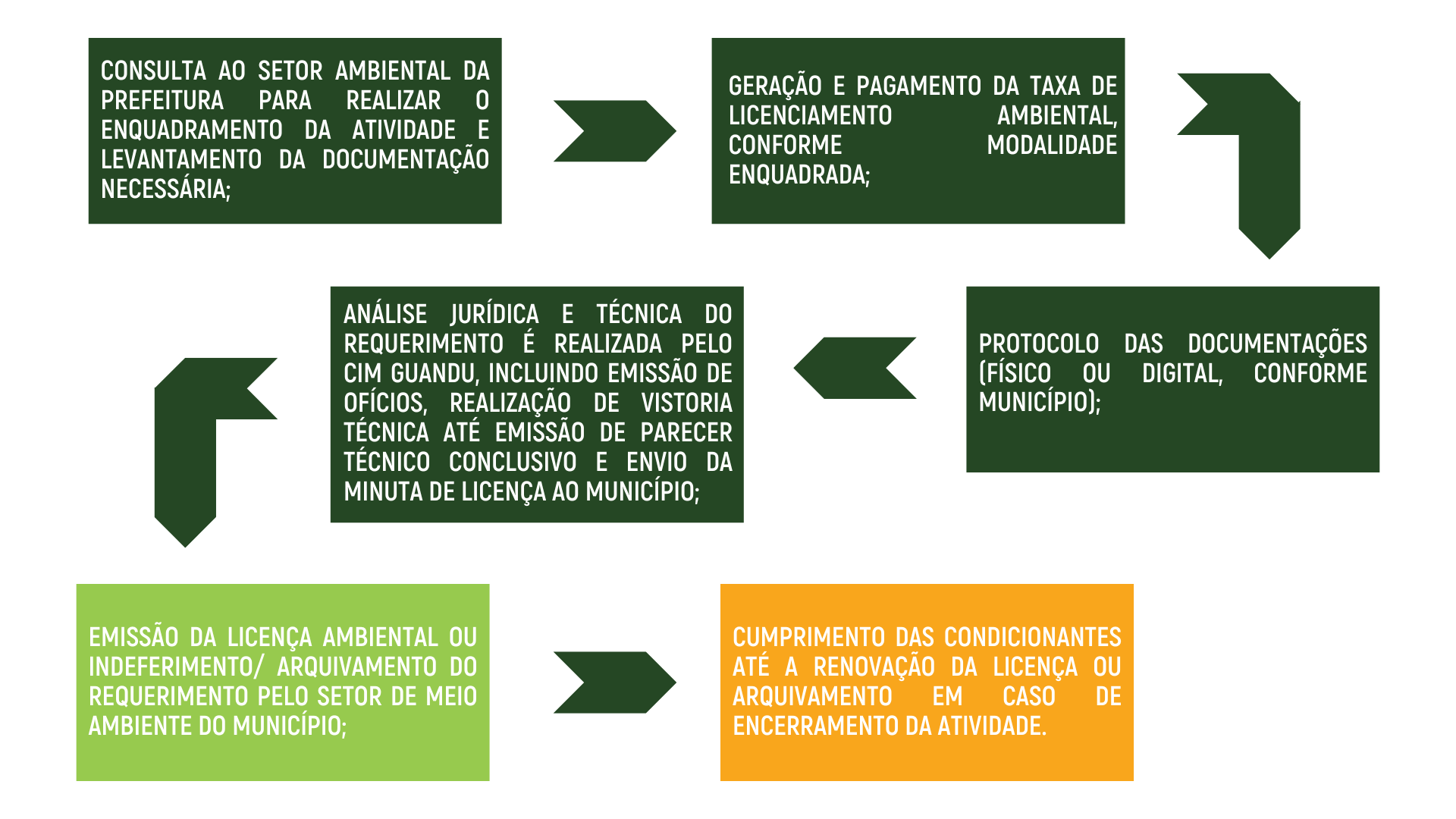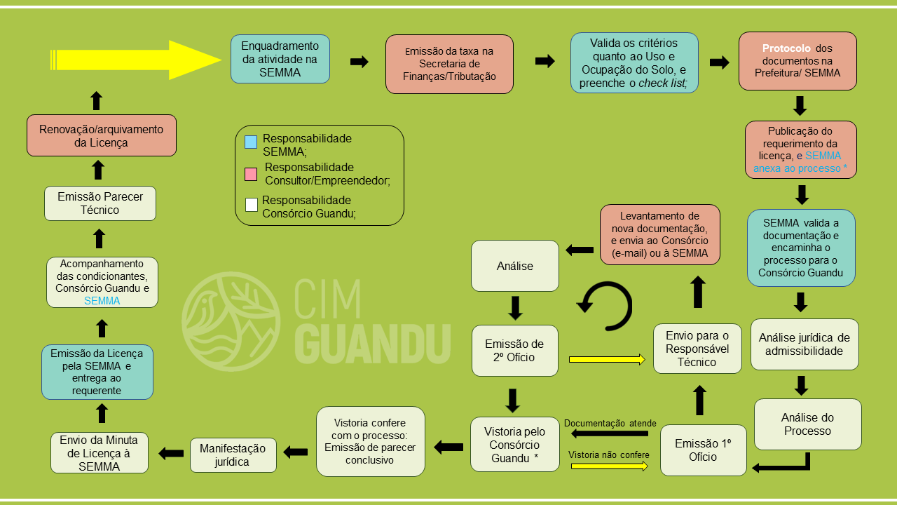 As etapas do Licenciamento seguem o fluxo representado abaixo, com o processo iniciando e finalizando no município. O Consórcio Intermunicipal Multifinalitário Guandu compõe o Sistema Municipal de Meio Ambiente e é o responsável pela análise técnica dos processos.